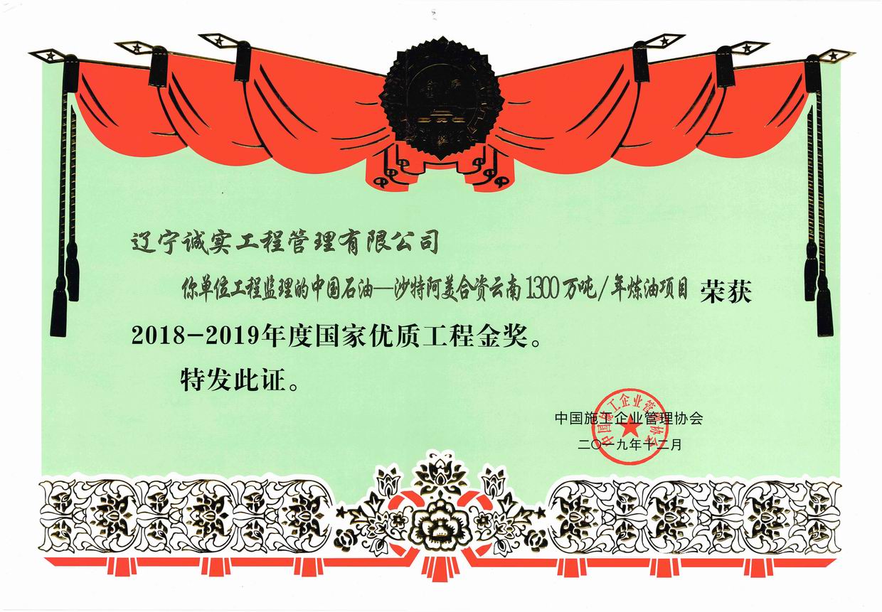 2019年12月,我單位所監(jiān)理的“煙臺萬華搬遷MDI一體化項目氯堿裝置區(qū)”被評為2018-2019年度國家優(yōu)質(zhì)工程獎、“中國石油-沙特阿美合資云南1300萬噸/年煉油項目”被評為2018-2019年度國家優(yōu)質(zhì)工程金獎。